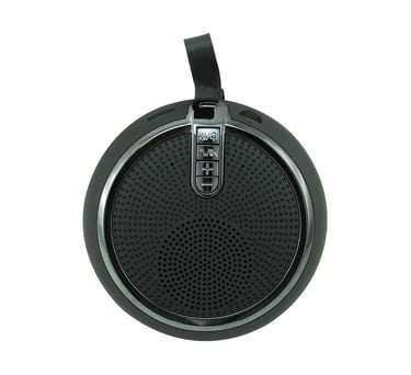 Mini parlante Bluetooth portátil de alta calidad, con gancho integrado para colgarlo y llevarlo a cualquier lugar. Compacto, con sonido potente y claro, ideal para reuniones familiares y encuentros pequeños.
